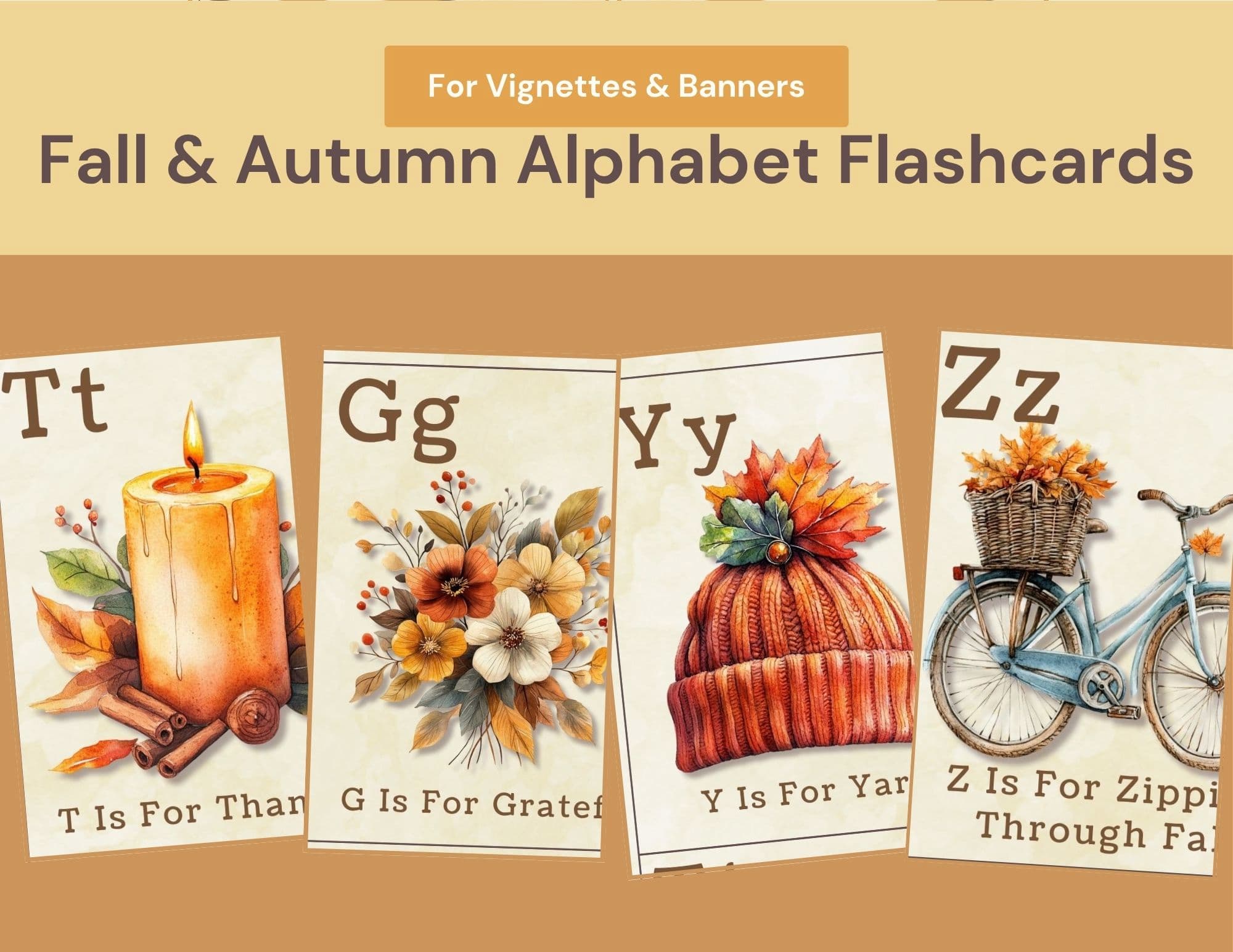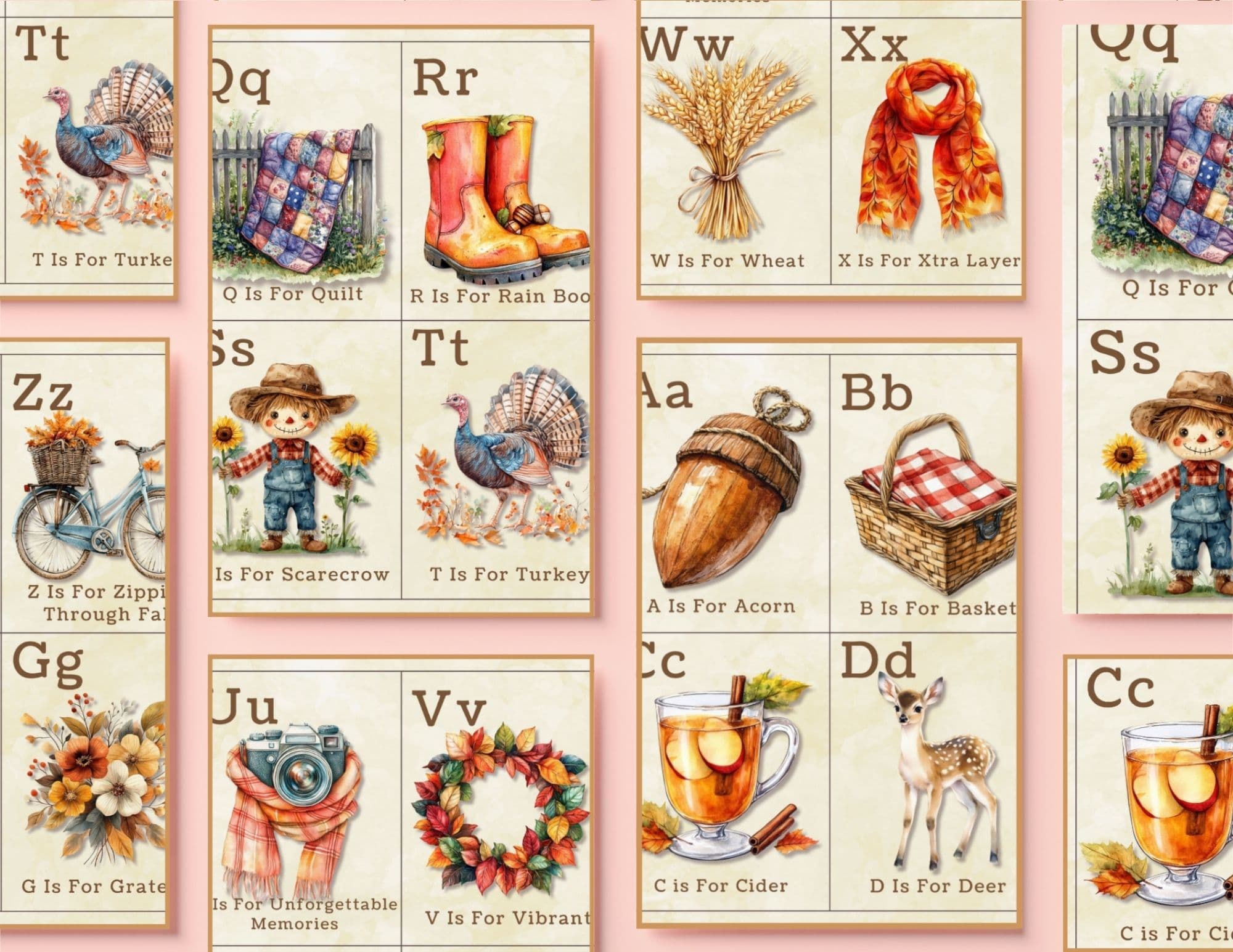 The Fall and Autumn Alphabet Cards include: